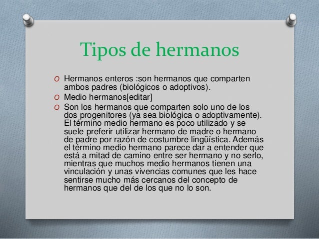 Son and daughter of the same father or mother a. Medios Hermanos Qué son los medios hermanos. Cada uno de los nacidos del mismo padre y de distinta madre. De acuerdo con los datos entregados por el Instituto Chileno de Terapia Familiar el 50 de los matrimonios que se celebra por primera vez llega al divorcio mientras que en el caso de las segundas nupcias esta situación alcanza al 75 o sea. María y Luis son medio hermanosMaria and Luis are half-brother and sister. Cuándo se considera que son medios hermanos. Los dos chicos se parecen mucho pero solo son medio hermanos. COMO AFECTA TENER MEDIOS HERMANOS. Cada uno tiene un padre y una madre diferentes.